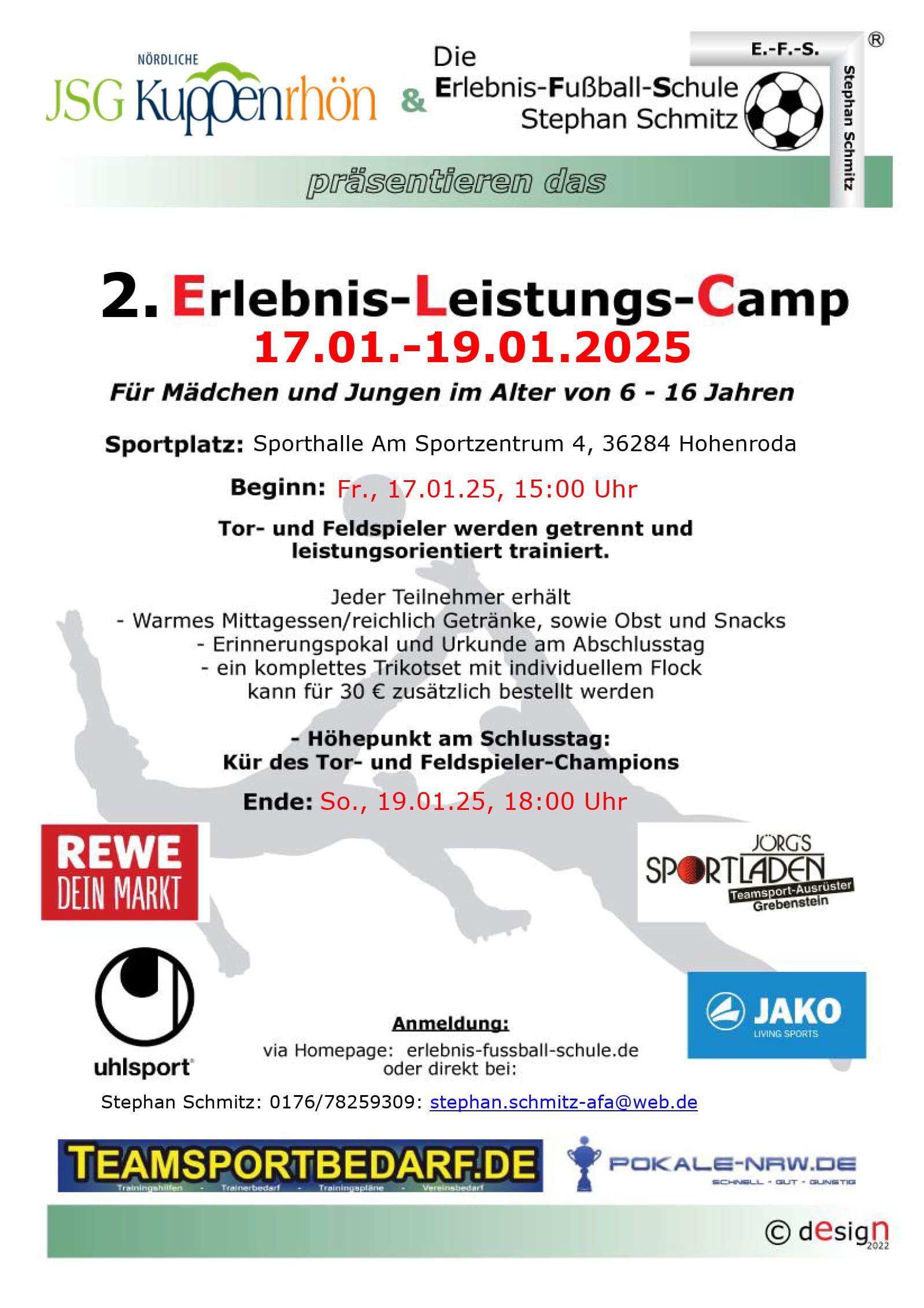 mit unserem Kooperationspartner EFS Stephan Schmitz statt. Hier warten drei spannende Tage unter dem Motto „Alles Fußball“ für Mädchen und Jungen auf Euch. Die Anmeldung läuft direkt online über die Homepage der Fußballschule mit dem entsprechenden Anmeldeformular, oder auch per Email. Gerne kann die Anmeldung auch direkt bei dem Verein abgegeben werden.