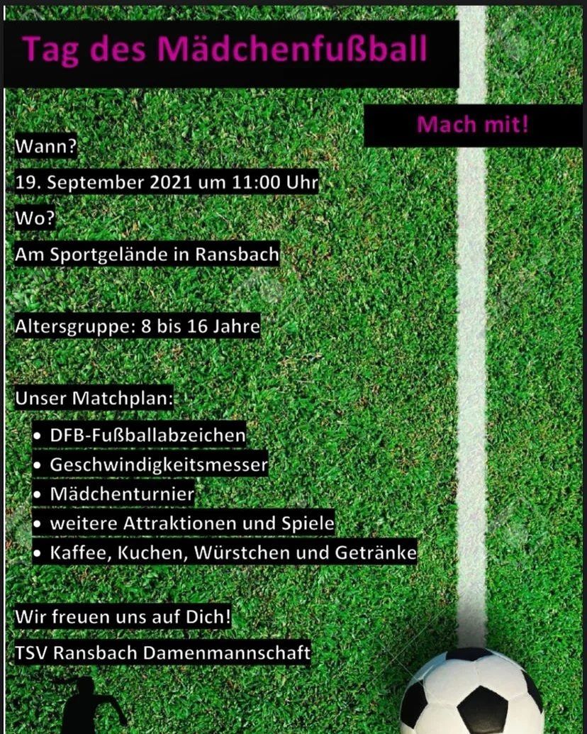 Der TSV Ransbach veranstaltet am Sonntag den 19.09.2021 den Tag des Mädchenfußball....kommt vorbei und besucht uns!